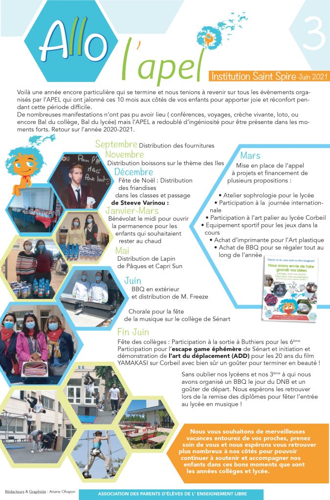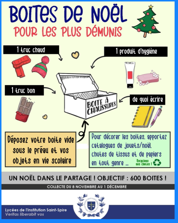 L’APEL se mobilise au côté du Lycée pour les plus démunis, vous souhaitez apporter votre aide jusqu’au 07 décembre n’hésitez pas à déposer : – Un habit chaud – Un produit d’hygiène – Une boite à chaussure – Un bloc note ou un stylo … sans oublier une petite gourmandise c’est Noel pour tout le monde 🙂